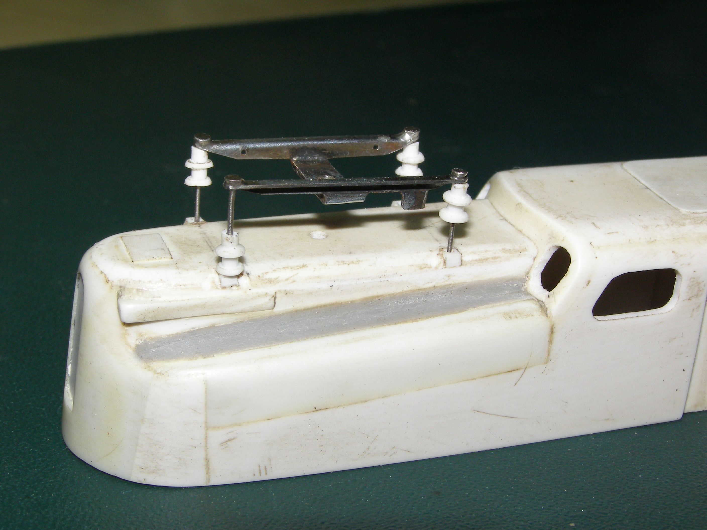 Здравствуйте всем! После небольшого перерыва выкладываю то что наработал. После нескольких проб и ошибок сделал наконец пантографы. Первоначальную раму, куда крепится пантограф забраковал - поучилась немного шире из-за чего ее нельзя было закрепить на корпусе. В результате переделывал ее пару раз. Потом возникла проблема - как и из чего сделать изоляторы. После нескольких попыток просто выточил их на своем станке. Вот что получилось, хочу услышать Ваше мнение.