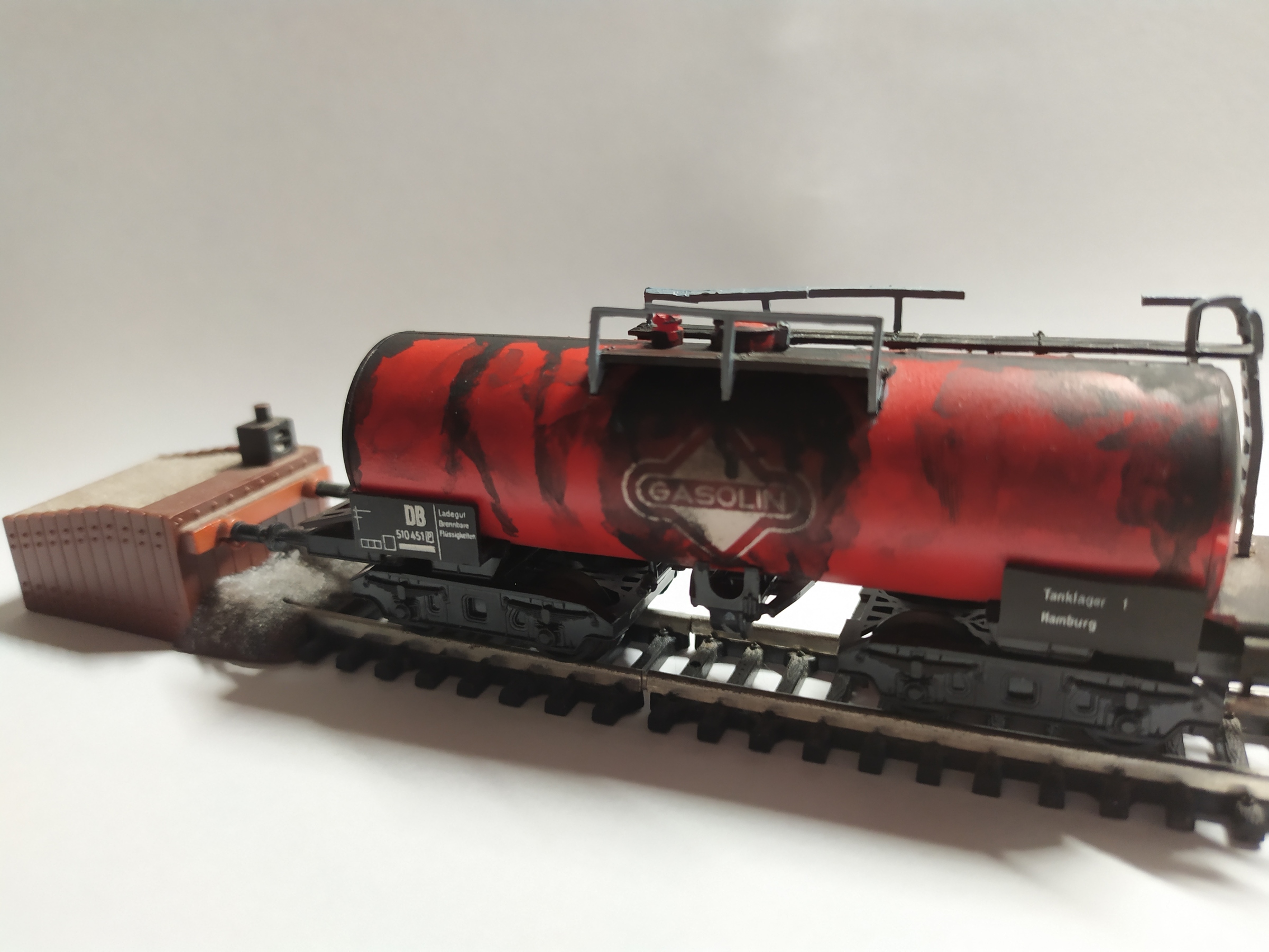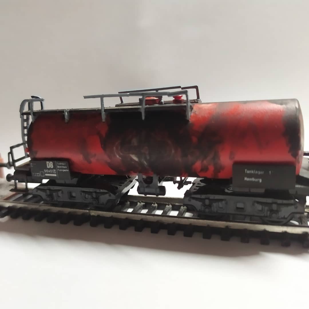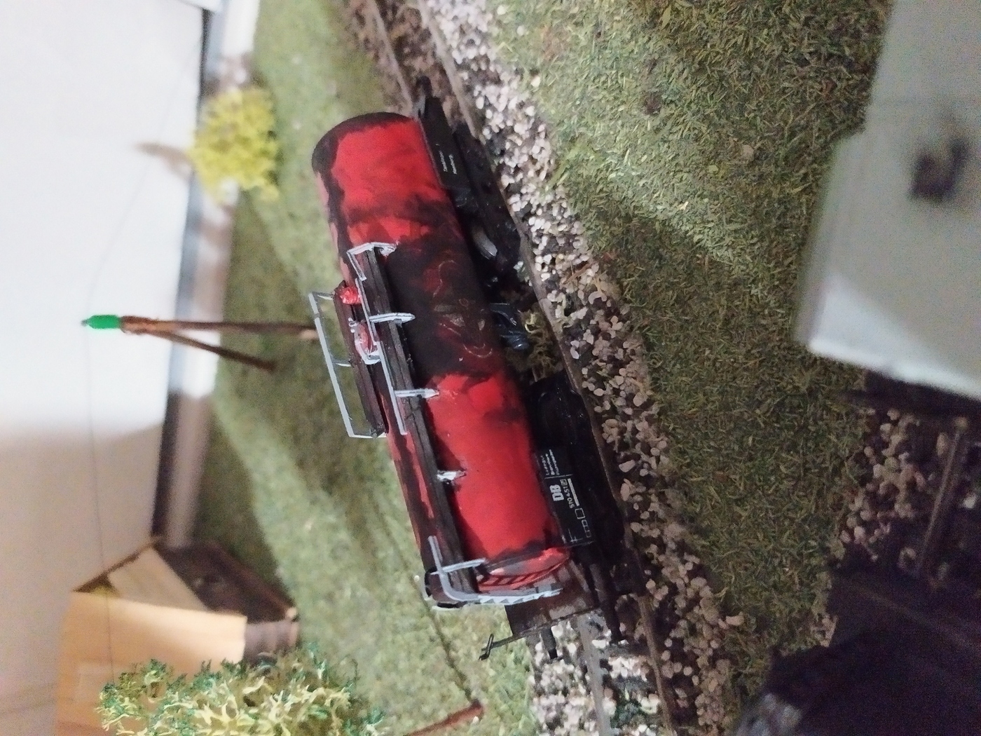 Выбрал я потрёпанную годами цистерну принадлежности DB, что стоит на макете как списанная. Результат на фото.