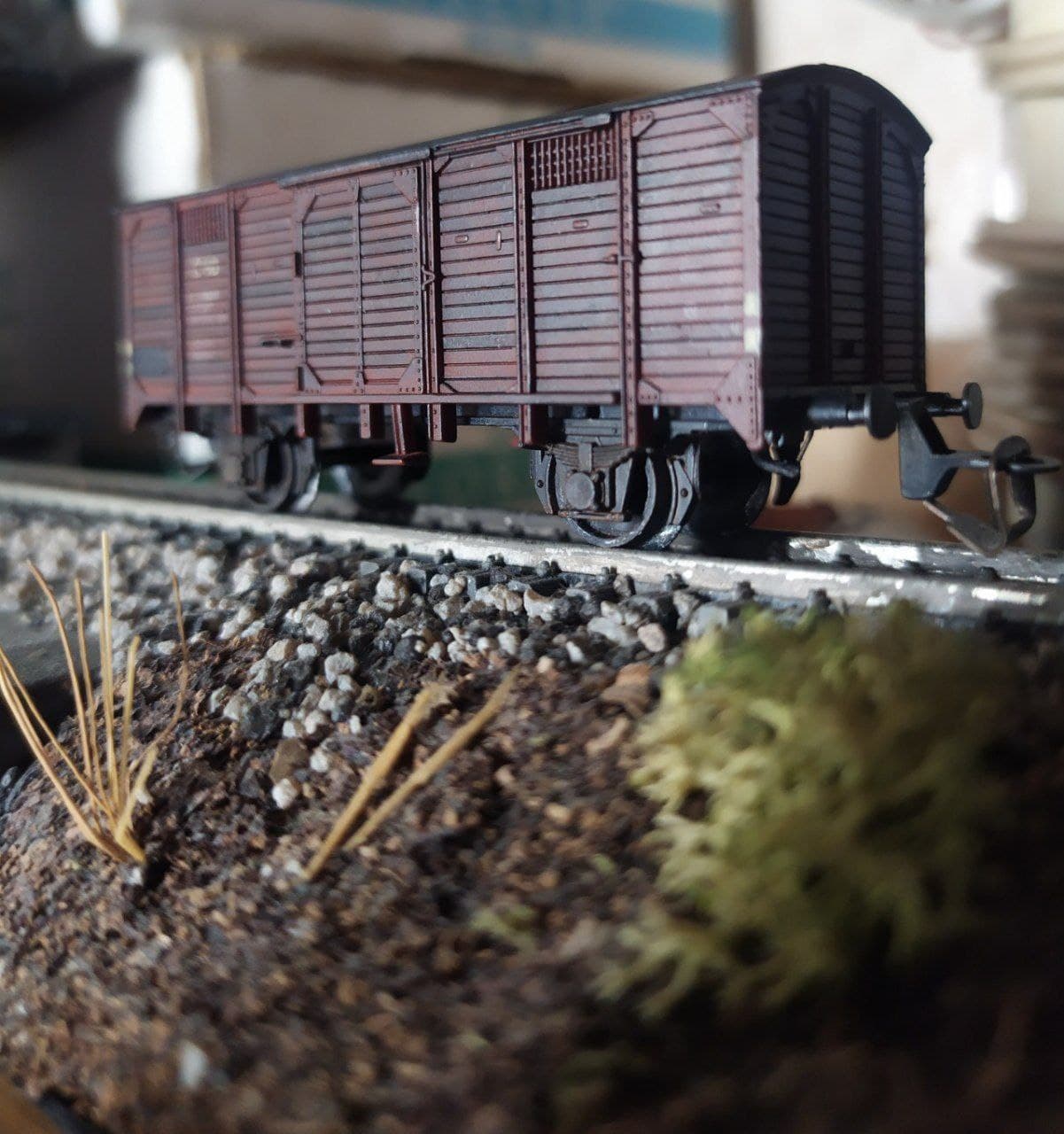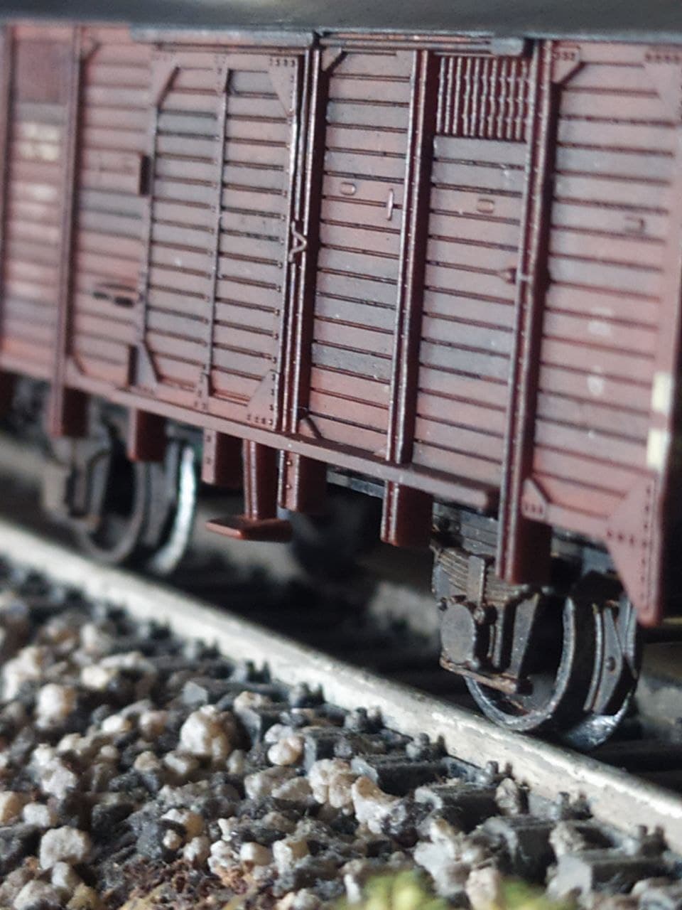 С цистернами пока не очень выходит, зато вот подкрасил крытый вагон, и очень рад результату. Правда на фото свет не так падает, позже сделаю при лучшем освещении.