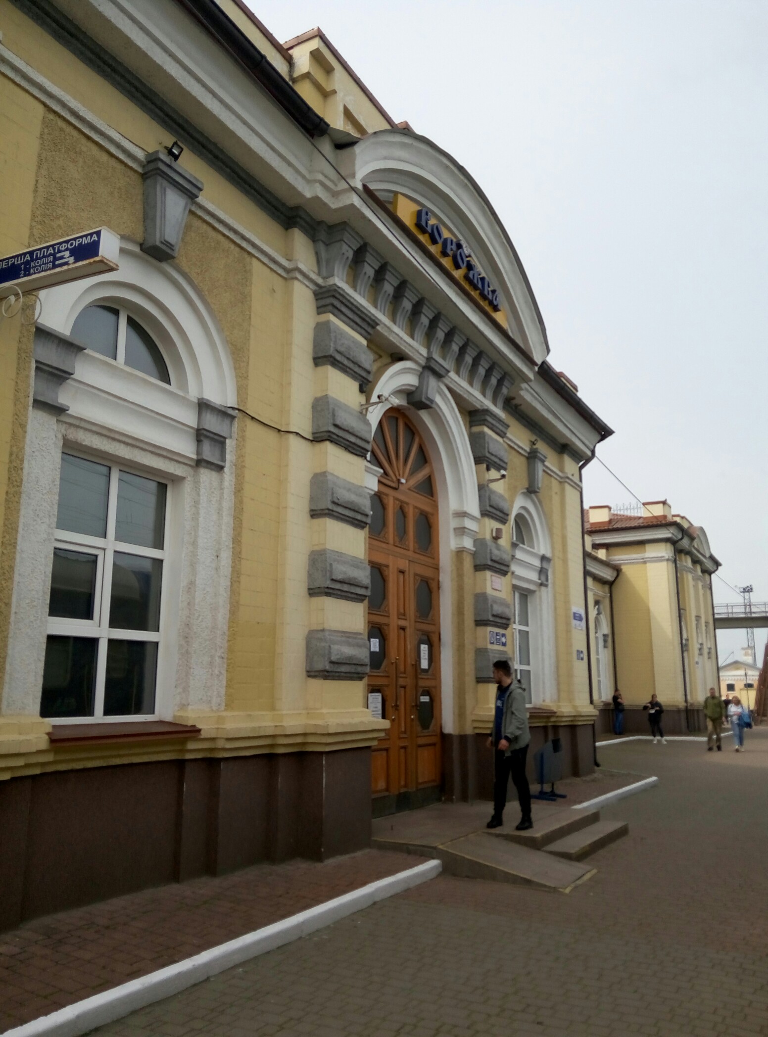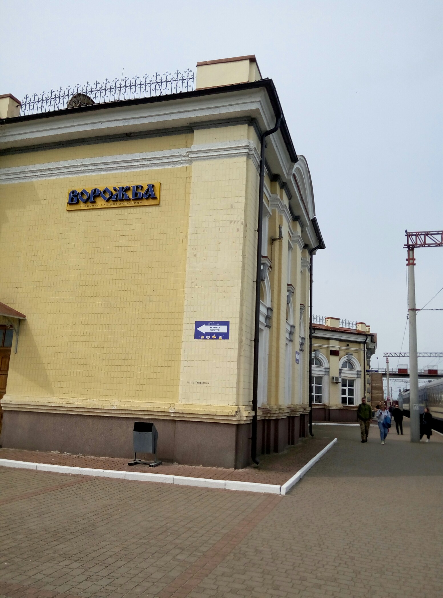 Недавно ехал через станцию Ворожба, здание вокзала которой имеет интересную архитектуру. Сейчас от нее начинается электрифицированный путь в направлении Конотопа. От Харькова до Ворожбы пассажирские поезда идут под тепловозами ТЭП70, а по Ворожбе производится смена локомотива на электровоз, в данном случае - на киевский ЧС4. На самой станции установлена интересная скульптура.